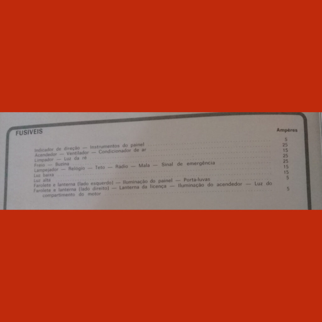 No caso do fusível voltar a queimar, não insista com outro e jamais aumente a potência dele. Pode ter um curto no circuito desse fusível que deve ser consertado ou pode causar sérios danos eletricos. Mas são consertos na sua maioria fáceis de resolver devido a simplicidade da parte elétrica desses modelos antigos da GM, assim como o Opala também. A lista abaixo é da esquerda para direita na caixa.