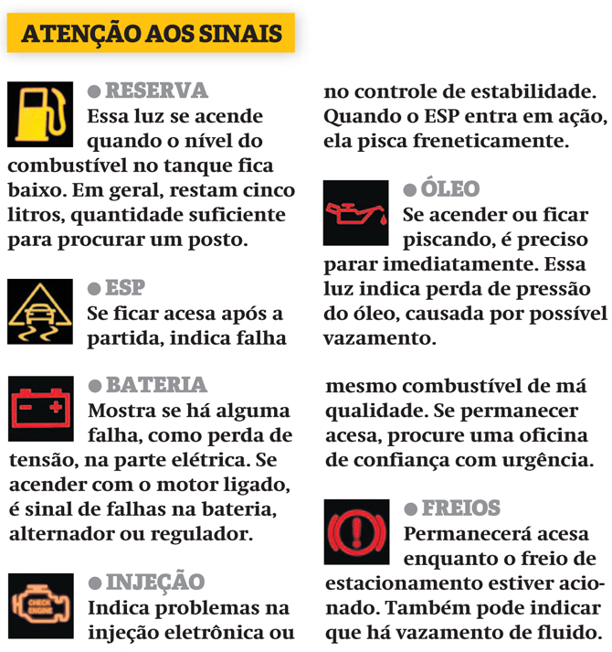 E, em alguns casos, explica quando e qual providência deve ser tomada. No manual existe um índice – normalmente no final dele – que leva às páginas com essas informações, todas bem explicadas pela fábrica.